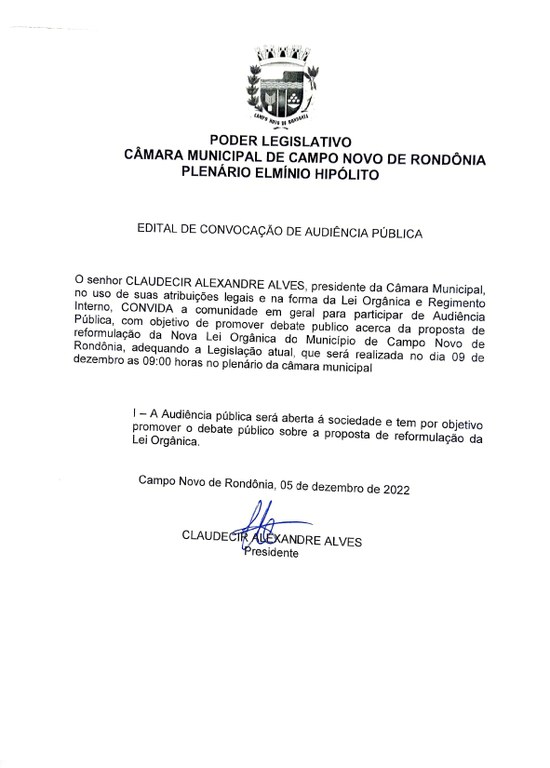 O senhor uso de CLAUDECIR ALEXANDRE ALVES, presidente da Câmara Municipal, suas atribuições legais e na forma da Lei Orgânica e Regimento Interno, CONVIDA a comunidade em geral para participar de Audiência Pública, com objetivo de promover debate público acerca da proposta de Rondônia, reformulação da Nova Lei Orgânica do Município de Campo Novo de adequando a dezembro Legislação atual, que será realizada no dia 09 de as 09:00 horas no plenário da câmara municipal.